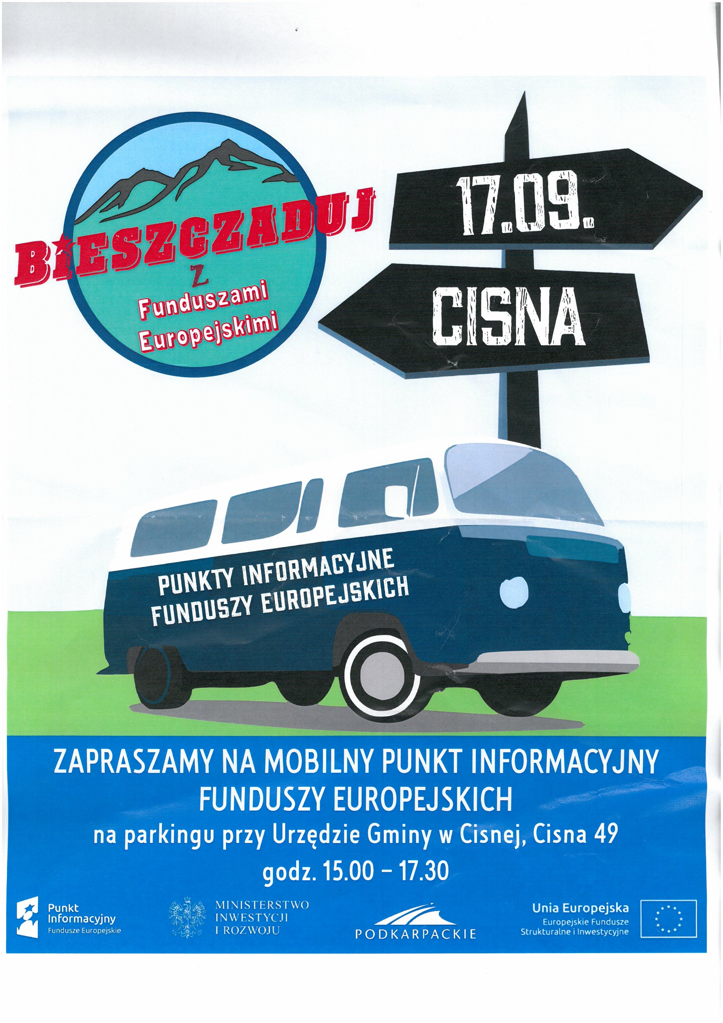ZAPRASZAMY NA MOBILNY PUNKT INFORMACYJNY FUNDUSZY EUROPEJSKICH W DNIU 17.09.2019R. NA PARKINGU PRZY URZĘDZIE GMINY W CISNEJ, CISNA 49 GODZ. 15.00 – 17.30