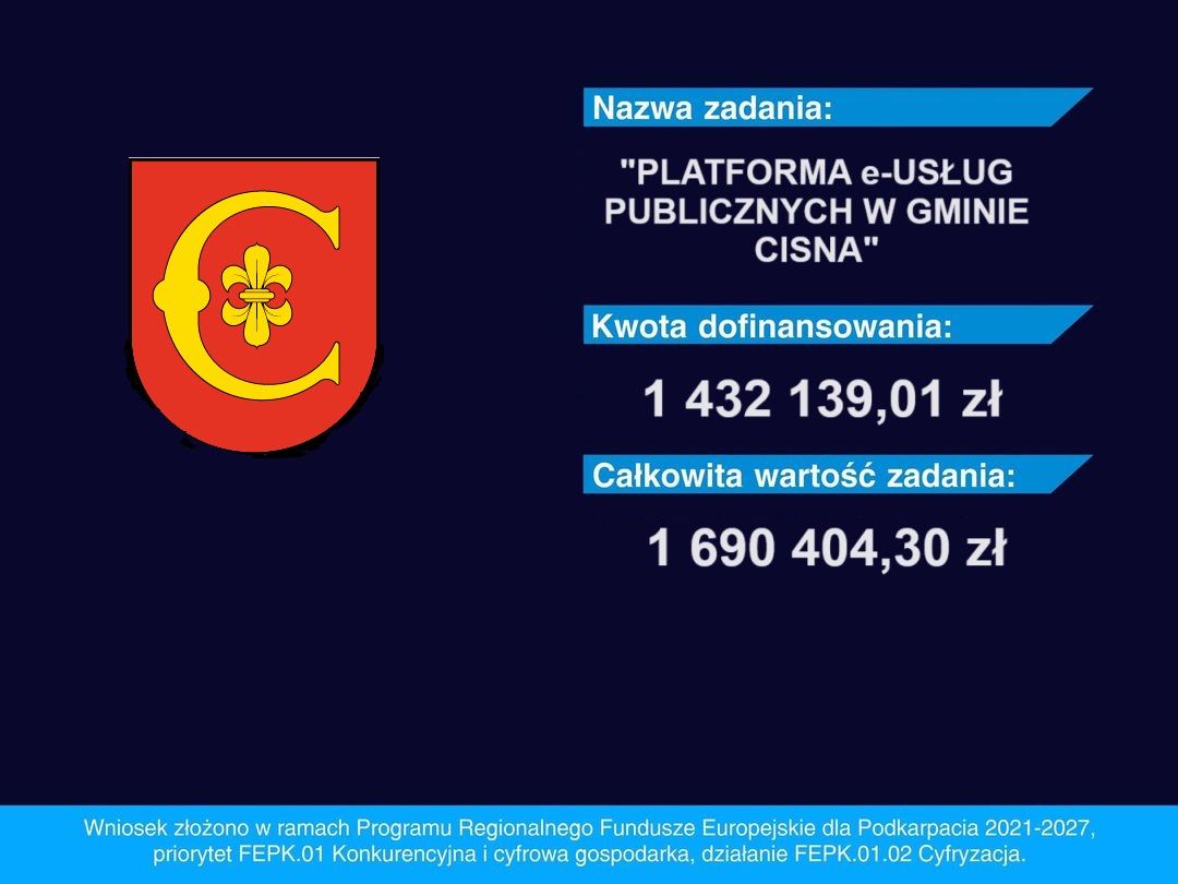 W ramach Regionalnego Programu Fundusze Dla Podkarpacia 2021-2027, otrzymaliśmy dofinansowanie w wysokości 1.432.139,01 zł na realizację projektu „platforma e-usług w Gminie Cisna”.