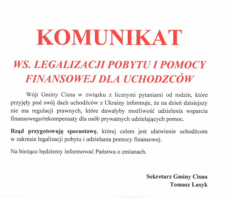 Wójt Gminy Cisna w związku z licznymi pytaniami od rodzin, które przyjęły pod swój dach uchodźców z Ukrainy informuje, że na dzień dzisiejszy nie ma regulacji prawnych, które dawałyby możliwość udzielenia wsparcia finansowego/rekompensaty dla osób prywatnych udzielających pomoc.