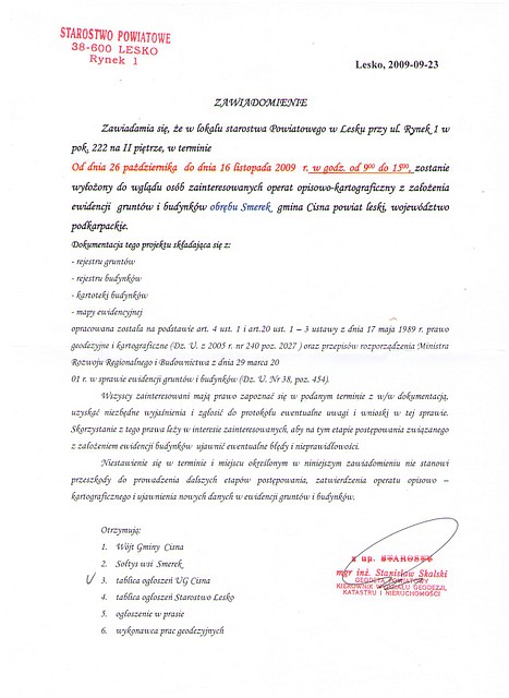Od dnia 26 października do 16 listopada 2009 r. w godz. od 9.00 do 15.00 zostanie wyłożony w Starostwie Powiatowym w Lesku operat opisowo- kartograficznego z ewidencji gruntów i budynków obrebu Smerek, gm. Cisna.