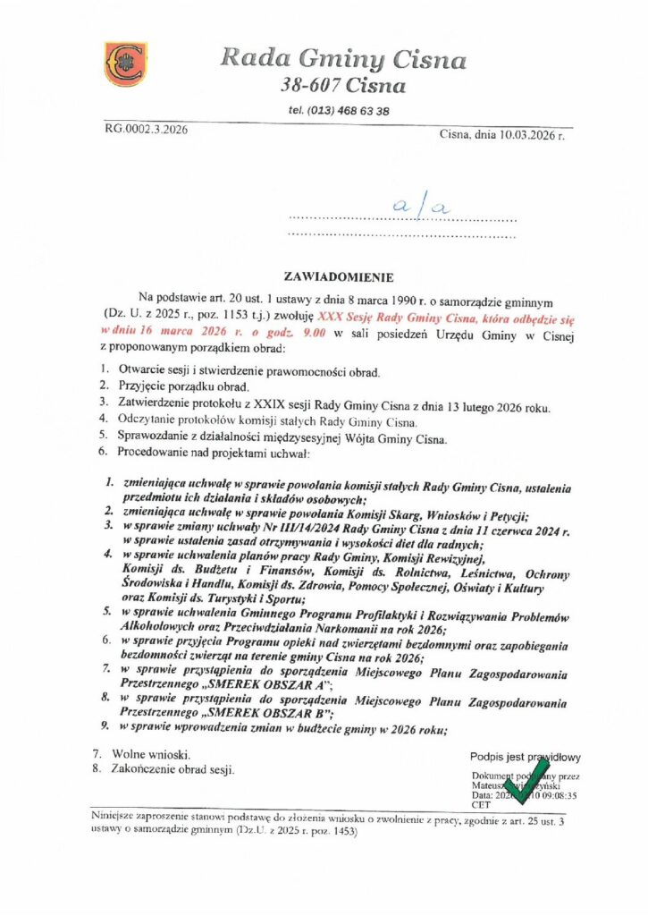 (Dz. U. z 2025 r., poz. 1153 t.j.) zwołuję XXX Sesję Rady Gminy Cisna, która odbędzie się w dniu 16 marca 2026 r. o godz. 9.00 w sali posiedzeń Urzędu Gminy w Cisnej z proponowanym porządkiem obrad: