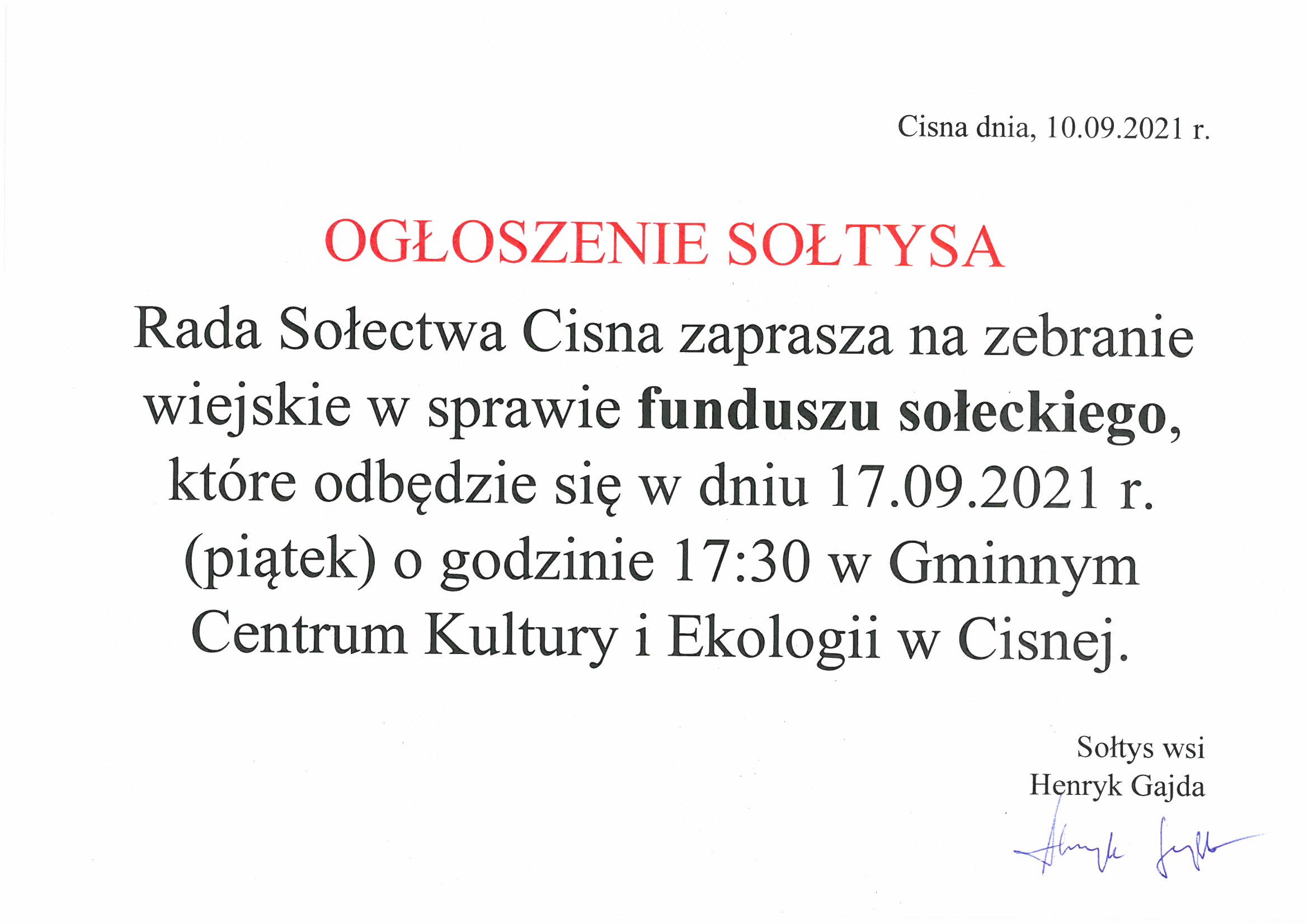 Rada Sołectwa Cisna zaprasza na zebranie wiejskie w sprawie funduszu sołeckiego,